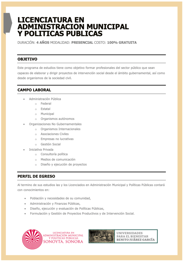 Si te interesa en formar parte de la nueva generación de estudiantes de la Licenciatura en Administración Municipal y Políticas Públicas de la UBBJ Sonoyta realiza tu pre-registro y te notificaremos cuando la plataforma esté activa para formalizar tu solicitud.